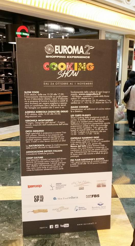 Cuochi qualificati appartenenti alla Les Chefs Blancs, la rinomata scuola romana di cucina, si esibiscono tutti i giorni da 24 ottobre al 1 novembre all'interno della Galleria Commerciale nell'elaborazione di ricette particolari a costi contenuti utilizzando prodotti a marchio Coop acquistati nel punto vendita. Le giornate si arricchiscono con altri eventi in programma a "tema alimentare"come dimostrazioni di cucina naturale e dietetica, laboratori sul cibo di qualità, consulenze e curiosità il contributo di esperti del settore. Nella galleria, di fronte alla barriera casse fornitori Unicoop Tirreno invitano alla degustazione di prodotti tipici e locali che si trovano in promozione per l'occasione all'interno del negozio così come lo stand dedicato Coop invita alla degustazione e agli acquisti della linea Viviverde in promozione all'interno del punto vendita.